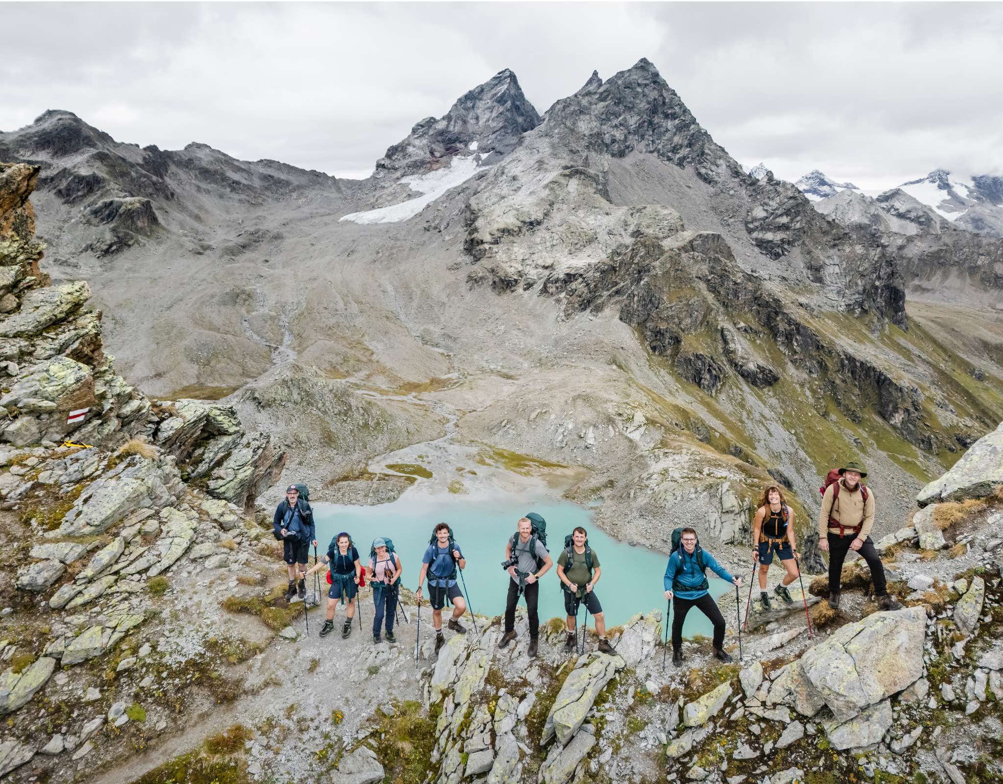 Le sentier devient de plus en plus raide et se transforme en un enchevêtrement de rochers instables. Pas à pas, Simon et Senne poursuivent leur ascension, leurs bâtons solidement ancrés entre les pierres. Une fois arrivés au sommet, ils sont récompensés : une nouvelle vallée s’étend sous leurs yeux, avec un lac de montagne d’un bleu vif qui scintille au loin.